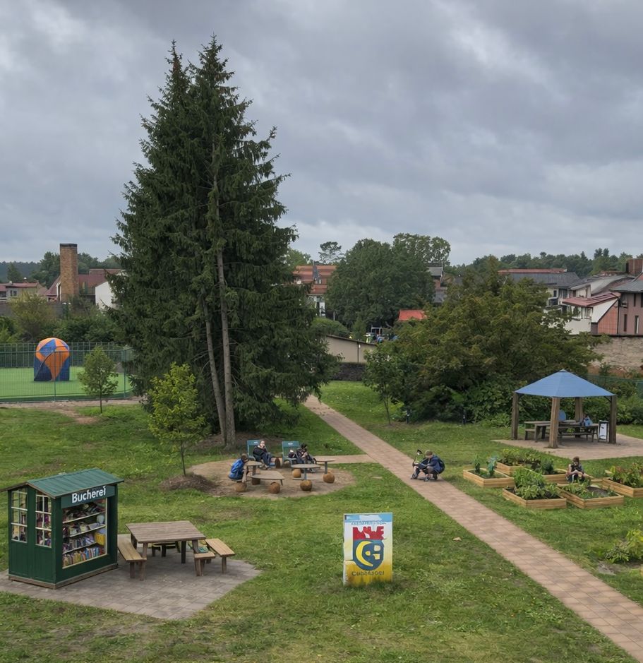 • Zum Beispiel Sitzgruppe, Baum, Spielgerät, Gartenbereich oder Bibliothek